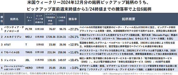 昨年12月分の米国ウィークリー「銘柄ピックアップ」について掲載直前週末終値から3/24終値までの騰落率上位6銘柄を見ると、AI(人工知能)によるビッグデータ解析のパランティア・テクノロジーズ(PLTR)が首位。中南米で事業展開するメルカドリブレ(MELI)、米国内で通信事業を営むAT&T(T)やTモバイルUS(TMUS)、およびグローバルXビデオゲーム&EスポーツETF(HERO)など、トランプ関税の影響を受けにくいとみられる銘柄が上位を占めた。電子機器受託製造のジェイビル(JBL)も関税に柔軟に対応しやすいだろう。