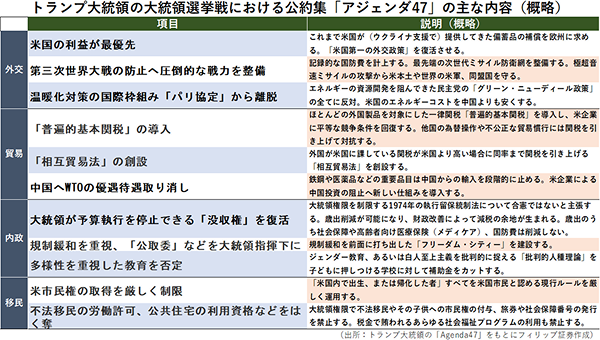トランプ米政権の関税を巡る「朝令暮改」による不確実性に対し、米国株市場の「恐怖指数」として知られるVIX指数が終値で3/11に27.86まで上昇。ところが、トランプ大統領による一連の政策は、大統領選挙戦時の公約集「アジェンダ47」と照らし合わせると、公約を忠実に実行しようとする政治家としての生真面目さが窺われる。