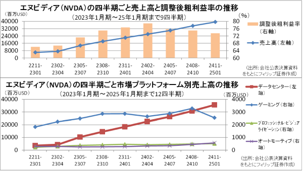 米半導体大手エヌビディア(NVDA)が2/26に発表した2024年11月-2025年1月期決算は売上高・純利益ともに市場予想を上回った。2025年2-4月期の売上高見通しも市場予想を上回った。データセンター部門は前年同期比93%増収で売上比率が約9割を占めた。AI(人工知能)半導体需要が引き続き拡大すると見られる中で主力の新型AI半導体「ブラックウェル」の売上が約110億USDに上った。