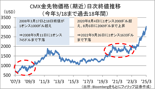 過去に金価格が1オンス1000ドル単位の節目を初めて突破後の推移を見ると、2008年3月に1000ドル超え後、同年9月まで約26%下落。2020年8月に初めて2000ドル突破後、2022年9月安値まで約21%下落した。中東情勢はトランプ米政権が断固とした姿勢を鮮明にし、ウクライナ情勢もプーチン露大統領との協議という新たな段階に入るなど硬軟使い分けて問題解決を模索中。必ずしも地政学リスクが高まっていると言い切れないだろう。