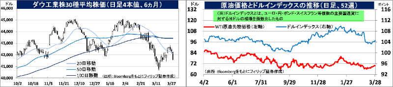 現地3/26、米トランプ大統領が米国へ輸入される自動車(完成車)および基幹部品について25%関税導入を発表。さらに3/30にも、4/2に発表予定の「相互関税」について「全ての国々」を対象に開始を計画していると述べ、当初は限定的な適用を期待していた市場関係者を失望させた。経済指標も、3/28発表の2月の米個人消費支出(PCE)価格指数および3月のミシガン大学米消費者態度指数・確定値が、景気悪化とインフレが併存する「スタグフレーション」の兆候として米国株の売りに拍車をかけた。