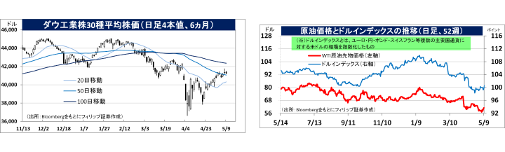 - S&P500の5/9終値は5659ポイントとなり、相場の中期的な方向性を示唆する200日移動平均の5748ポイントに迫ってきた。200日移動平均は4/2の5762ポイントを過去最高値として、横ばいに近い緩やかな下落となっている。これは、中期的な相場の方向性が上にも下にもはっきりしないことを示唆している面もある。一方、ダウ工業株30種平均(ダウ平均)株価は、5/9終値が4万1249ドルと、200日移動平均の4万2236ドルまであと約2.4%まで迫る中、5/9の200日移動平均は史上最高値水準にある。S&P500の200日移動平均で過去最高値を付けた4/2には4万2180ドルだったことから緩やかながらも上昇を維持している。ダウ平均で見た場合、米国株式市場の中期的上昇トレンドはまだ崩れたとは言えない。