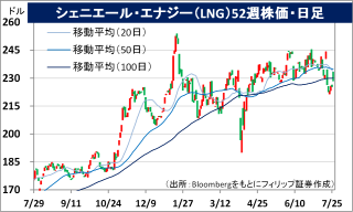 - 通期会社計画は、調整後EBITDAが前期比6-14%増の65-70億USD、分配可能キャッシュフローが同10-23%増の41-46億USDと従来計画を据え置いた。EU(欧州連合)は7/27、米国との関税交渉で合意し、天然ガスを含む戦略物資を3年間で7500億USD相当を米国から購入することを約束した。日米関税合意でも、日本はLNGなど米国産エネルギーの安定的、長期的な購入を約束している。