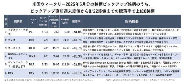 2025年5月分の米国ウィークリー「銘柄ピックアップ」について掲載直前週末終値から8/22終値までの騰落率上位6銘柄のうち、欧州を中心に主要国の国防費増額を受けて、衛星データを扱うプラネット・ラボズ(PL)に加え、防衛関連のRTX(RTX)も堅調に推移。人工知能(AI)ブームに伴う電力需要の急増を受けて、原子力発電関連のカメコ(CCJ)やヴァンエック・ウラン原子力ETF(NLR)、データセンターの光ファイバー需要に関連したコーニング(GLW)も好調だ。物品サービス税引き下げが決まったインド関連銘柄も見直し余地がある。