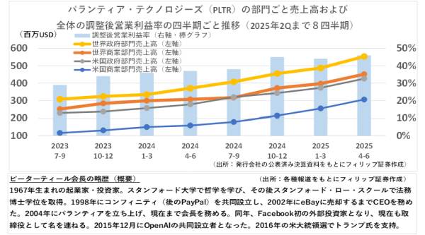 データ解析ソフトの米パランティア・テクノロジーズ(PLTR)が8/4に発表した2025年4-6月期決算は、売上高が前年同期比48%増の10.03億USD、純利益が2.4倍の3.26億USD。トランプ米政権に接近して米軍との契約を増やしているほか、民間企業向けのAI(人工知能)関連サービスが伸びたことを受け、全体の7割を占める米国売上高のうち政府向けが53%増、米民間企業向けが93%増と拡大している。