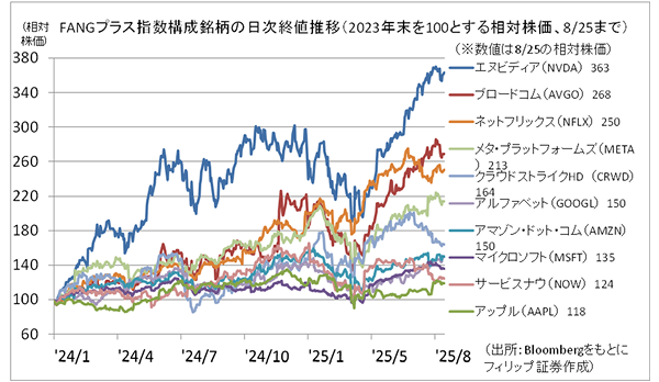 「NYSE FANG+指数」は、米国大手IT企業のメタ・プラットフォームズ(META)、アマゾン・ドット・コム(AMZN)、ネットフリックス(NFLX)、アルファベット(GOOGL)の4社にアップル(AAPL)、マイクロソフト(MSFT)の6銘柄が原則として組み入れられ、時価総額や売上高などに基づき、残りの4銘柄が選定される。構成銘柄は四半期に一度見直しが実施され、2024年9月の銘柄入れ替え以降、エヌビディア(NVDA)、ブロードコム(AVGO)、クラウドストライクHD(CRWD)、サービスナウ(NOW)が残り4銘柄となっている。