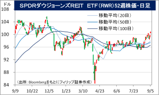 - 昨年末終値から9/5終値までの騰落率は、当ETF(インカムゲインを除く)が+2.0%に対し、ダウ工業株30種平均株価が+6.7%、S&P500株価指数が+10.2%、ナスダック100が+12.6%。8月の米雇用統計発表後に市場で大幅利下げ観測が強まる中、住宅・不動産関連への物色が予想される。間接的な米国不動産への投資としてREIT(上場不動産投資信託)への投資が注目を集めそうだ。