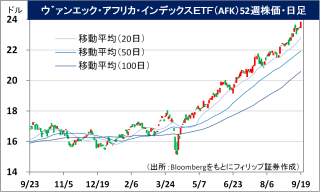 - 昨年末終値から9/19終値までの騰落率は、当ETF(インカムゲインを除く)が+54.1%に対し、ダウ工業株30種平均株価が+8.9%、S&P500株価指数が+13.3%、ナスダック100が+17.2%。新興国市場でアフリカ諸国の存在感が高まる中、米FRB(連邦準備理事会)の年内利下げ継続見通しに伴ってグローバル投資資金が米国外へシフトする場合、アフリカへの投資割合の増加が見込まれる。