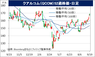 - 2025/9期4Q(7-9月)会社計画は、売上高が前年同期比1-8%増の103-111億USD、調整後EPSが同2-10%増の2.75-2.95USD。アップル(AAPL)は、9/19に発売の新型スマホ「iPhone17」について購入予約が好調につき生産増強に動いていると報じられた。半導体のモデムチップに関してクアルコムは2026年のiPhone発売分まではアップルにライセンスを供与していることから恩恵を受ける見通し。