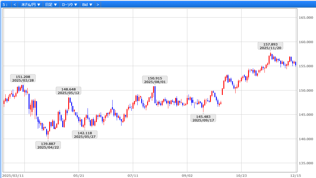 今週は米国の経済指標と日銀金融政策決定会合が焦点となります。米国では12/15にNY連銀製造業景気指数、12/16に11月雇用統計、12/18に11月消費者物価指数などが発表されます。雇用統計は非農業部門就業者数が5.0万人増に留まる見通しで、労働市場の減速が懸念されれば、FRBの来年以降の追加利下げ観測が強まり、ドル円の上値を抑える可能性があります。一方、12/18-19の日銀金融政策決定会合では、@0.25%の利上げも「緩和度合いの調整」に留まり、円安基調が継続するか、A中立金利の下限引き上げを示唆し、金利正常化期待から円買いが進むかが分岐点となります。これらを踏まえ、20日移動平均線(156円05銭)を下値支持線として157円台を回復するか、基準線(155円35銭)を割り込み12/5安値(154円35銭)を試す展開となるか注目されます。