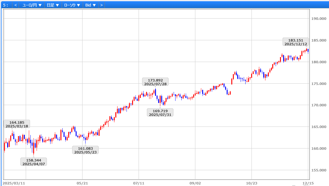 FOMCを控え、ユーロドルは1.16ドル台半ばを挟んだもみ合いが続き、12/9には1.1615ドルへ下落しました。ただ、シュナーベルECB専務理事が「次の政策変更が利上げになるとの期待に満足」と発言したほか、12/10のFOMCで0.25%の利下げが決定され、パウエル議長が「労働市場のセンチメントは低下している」と述べるなど、想定されていたタカ派寄りの内容とならなかったことからドル売りが進行。加えて、12/18のECB理事会で成長見通しが上方修正されるとの観測も支えとなり、12/11には1.1763ドルへ上昇しました。その後も1.17ドル台を維持し、1.1740ドルで取引を終えています。一方、ユーロ円は12/8の180円50銭を安値に、国内要因による円売りや米株高を背景としたリスク選好、ユーロドルの堅調を追い風に上昇し、12/12には183円15銭と連日で史上最高値を更新、182円91銭で取引を終えました。