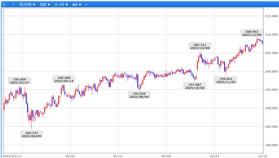 今週のポンドは、12/18の英中銀政策委員会を巡り、0.25%利下げの可能性や来年第1四半期の追加利下げ観測が上値を抑える要因となりそうです。同日のECB理事会では次の一手が利上げとの見方が強まり、ロシア・ウクライナ情勢を巡る和平進展期待と相まって、対ユーロでのポンド安が進めば、対ドルでは12/9安値の1.3288ドルを下抜け、20日移動平均線の1.3236ドルが意識されます。一方、11月英予算案を巡るリスクプレミアムが今後数週間で剥落すれば下値支援材料となります。加えて、12/16・18発表の米11月雇用統計やCPIを受け、来年1月FOMCでの追加利下げ観測が強まれば、12/11高値の1.3438ドルを上抜け、1.35ドル台回復が視野に入ります。また、ポンド円は209円台定着の可否が焦点で、日銀金融政策決定会合後のドル円動向次第では上昇加速か、転換線(207円12銭)を意識した調整局面のいずれの方向を辿ることになるか注目されます。