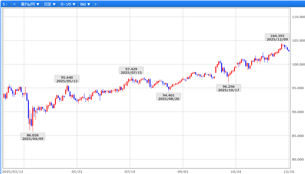 12/8の154円90銭を安値に、@12/9の衆院予算委員会で植田日銀総裁が「長期金利上昇局面では国債買入れ増額もあり得る」と述べ、緩和志向が意識されたこと、A米週次ADPや9‐10月JOLTS求人件数の改善を好感、156円95銭へ上昇しました。しかし、12/10のFOMCでは予想通り0.25%の利下げが決定され、パウエル議長が「労働市場のセンチメントは低下している」と述べるなど、市場が想定していた「タカ派寄りの利下げ」とならなかったことから155円80銭へ下落。さらに、12/11の米新規失業保険申請件数の悪化を受けて154円95銭へ一段安。ただ、12/8の154円90銭の安値手前で下げ止まり、米長期金利の持ち直しを背景に156円台を回復、155円81銭で取引を終えました。