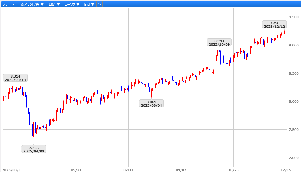 前週12/5引け後にムーディーズが南アのソブリン格付けをBa2で据え置き、見通しも「安定的」としたことで、期待されていた「ポジティブ」への引き上げが見送られ、12/8に9円13銭まで下落しました。ただ、9円13銭を下値に、米ADP雇用統計やJOLTS求人件数の改善を受けたドル円の上昇に連れ反発。さらに、FOMC後のドル安や米新規失業保険申請件数の悪化を背景に対ドルで堅調さを維持しました。加えて、南ア全株指数の3日続伸や金価格の上昇も追い風となり、12/12には9円26銭まで上昇し、9円22銭で取引を終えました。
