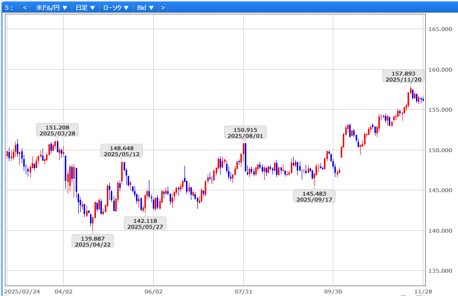 先週のドル円は、11/21のNY連銀総裁による12月利下げに前向きな発言や、日銀・増審議委員の早期利上げ示唆の影響を受けて156円58銭から取引を開始しました。ただ、海外勢による根強い円先安観が下値を支え、11/24のNY市場では157円19銭へ反発。その後は米長期金利の低下基調を背景に上値が抑えられ、ADP週次雇用者数の減少や米11月消費者信頼感指数の7カ月ぶり低下に加え、日銀の12月利上げ観測も重なり、11/26には155円65銭まで下落しました。週後半にかけても156円台半ばから後半での重さが意識され、転換線(156円36銭)を挟んだ攻防が続く中、156円18銭で取引を終えました。
