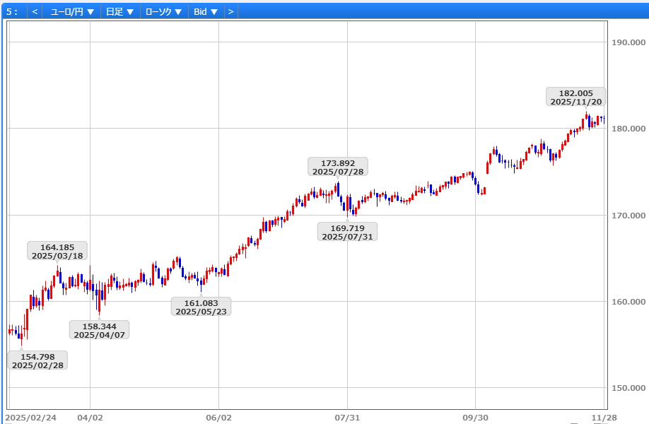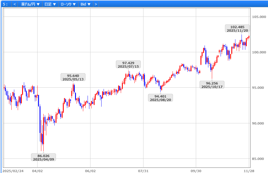 11/24に101円48銭の高値を付けた後、10月CPI発表を前にしたポジション調整から11/25には100円35銭へ下落しました。しかしCPIが予想を上回り、当面の利下げ観測が後退すると102円03銭へ急反発。その後も堅調な展開が続き、NY主要株価指数の5連騰によるリスク選好も追い風となり、11/28には102円37銭まで上昇しました。ただし、昨年11/7高値を上回った11/20の102円49銭が上値抵抗として意識され、102円25銭で取引を終えました。
