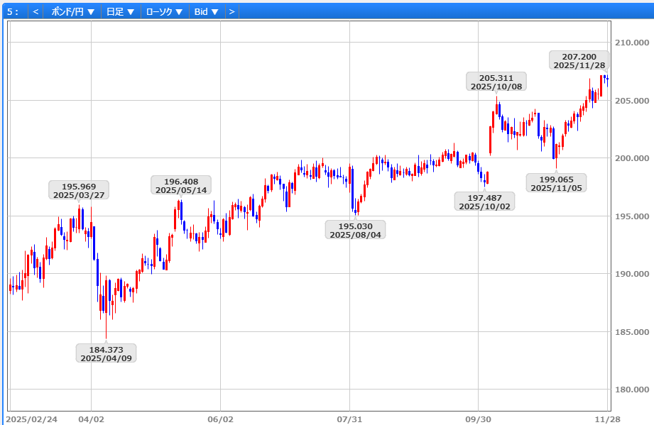 ポンドは対ドル・対円ともに11/24の1.3080ドル、204円80銭を安値に堅調に推移し、11/27には1.3268ドル、207円23銭へ上昇。先週末は1.3239ドル、206円79銭で取引を終えています。こうした背景には、@11/26公表の秋季予算案で所得税の実質増税や高級不動産課税強化など財政再建が示され、市場が財政規律を好感したこと、A米ADP週次雇用の減少や消費者信頼感指数の低下を受けてFRBの12月利下げが確実視されるとともに米金利が低下したこと、B英FTSE100やNY主要株価指数の続伸によるリスク選好の強まりなどの要因が挙げられます。