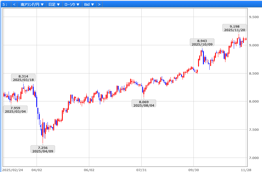 11/24の8円97銭を安値に、米経済指標の弱含みを受けた12月利下げ観測の高まりに加え、南ア主要産品の金・プラチナ価格の続伸、南ア全株指数の3連騰が追い風となり11/26にかけて9円14銭へ反発しました。ただし、11/20に2018年2月以来の高値となる9円20銭へ上昇した反動もあり、利益確定売りやポジション調整が上値を抑制し、9円12銭で先週末の取引を終えています。