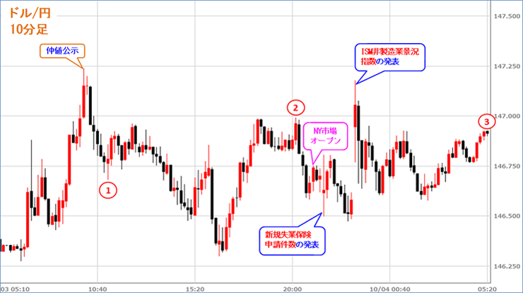 (3)米国市場では、序盤に発表された米新規失業保険申請件数が市場予想の22.1万件を上回る22.5万件と冴えない結果となったこともあり、序盤のドル円・クロス円は上値の重い動きとなった。その後に発表された9月の米ISM非製造業景況指数が市場予想の51.7を上回る54.9となり、2023年2月以来の高水準となったことを受けて、ドルは主要通貨に対して上昇した。ドル/円は、発表前の146.47から147.18まで上昇したものの、アジア時間に付けた8/19以来の高値の147.24には届かなかった。また、雇用指数が48.1と予想の50.0を下回り、基準となる50を下回ったことが影響してドルは失速、さらに地政学リスクの高まりも影響してドル円・クロス円は上値の重い動きとなった。