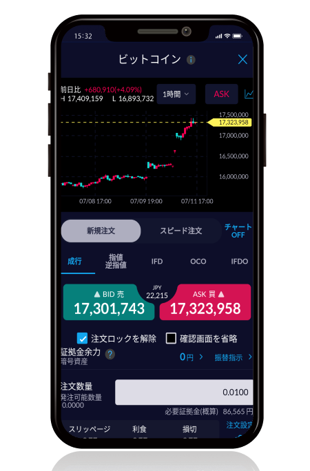 ワンタップで新規・決済、スピード注文が可能