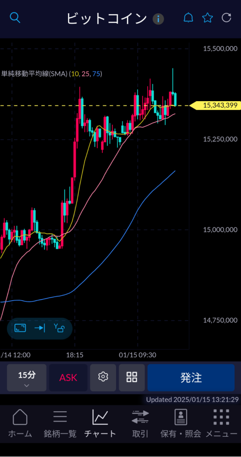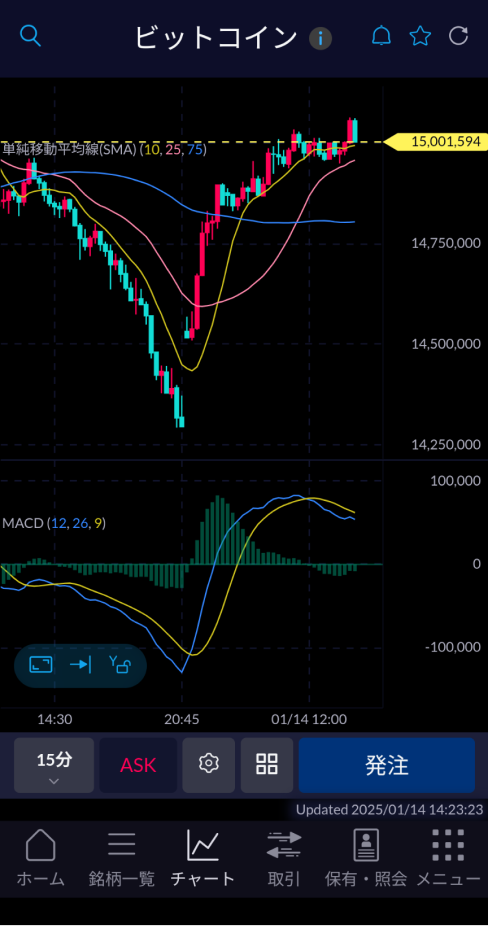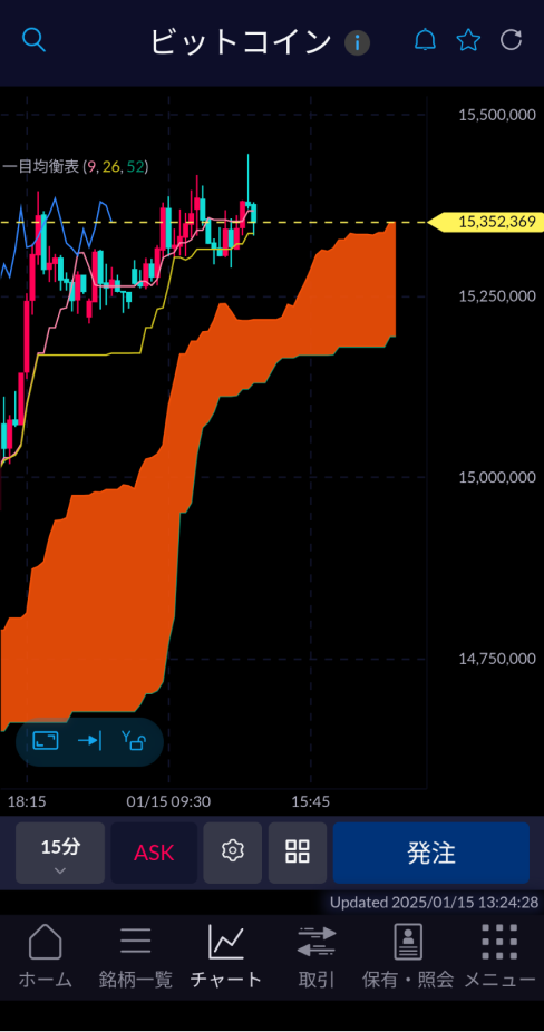 PCに匹敵するチャート分析が可能9種類のテクニカル指標とトレンドライン描画機能搭載複数のテクニカルを同時に描画するチャート等、ユニークな分析機能も充実。スマホアプリでPCに匹敵する本格的なチャート分析ができ、値動きの方向性を分析する移動平均線、一目均衡表、ボリンジャーバンドなどのトレンド系指標や、売買のタイミングを探るMACDなどのオシレーター系指標をチャートに表示できます。テクニカル指標と同じ画面上ではトレンドラインの描画・編集も可能です。 Tips 高度なテクニカル分析機能