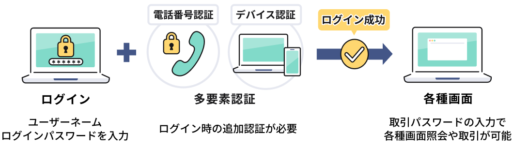 - 旅行先や出張先など普段と異なる場所からのアクセスや、スマホの機種変更、パソコンを買替えたときなどの普段と異なる端末からのアクセスの場合など、ご本人様のお取引でも認証が求められる可能性があります。