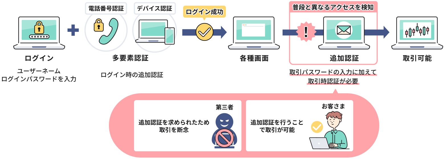 お客さまの資産の安全を確保するため、「普段と異なる」と判定された場合に追加認証を行います。