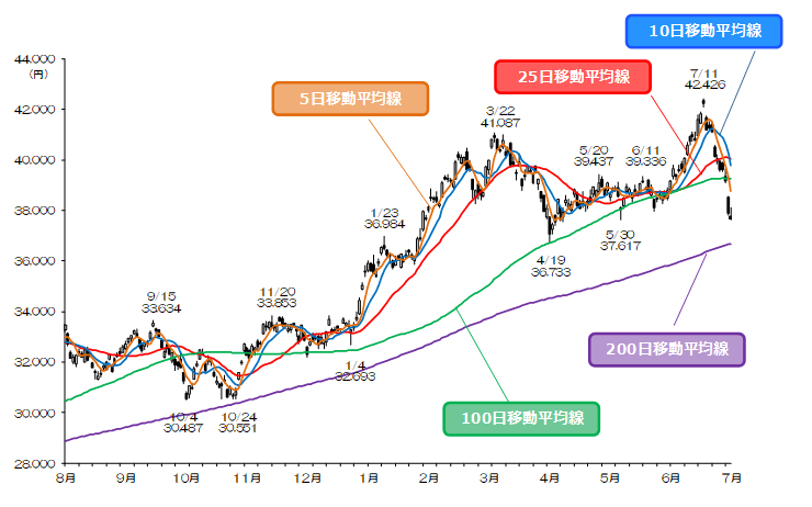 上値メドは、5日移動平均線(38,777円 同)、100日移動平均線(39,237円 同)、10日(39,763円 同)、25日移動平均線(40,053円 同)、40,500円、7/17安値(41,054円)などが考えられる。下値メドは、心理的節目の37,000円、4/19安値(36,773円)や200日移動平均線、心理的節目の36,000円や35,500円などがある。