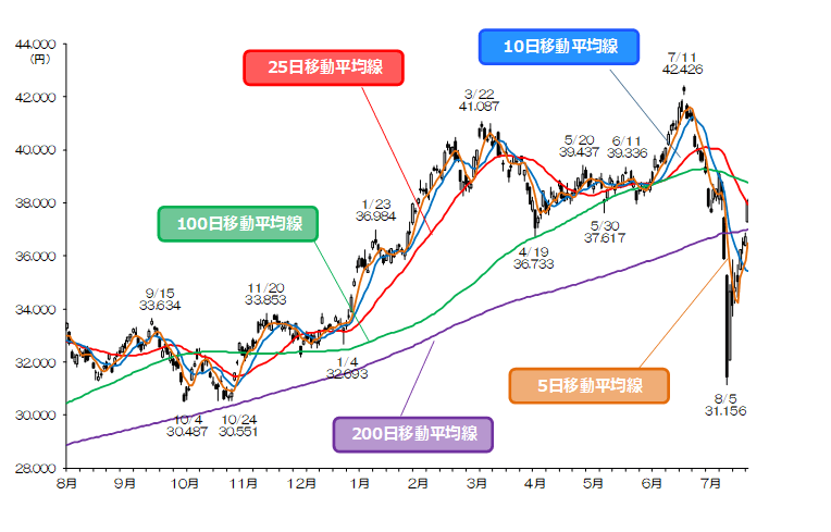 一方、25日移動平均線は依然として下落基調にあることや、7月後半のもみ合い水準に差し掛かったことで、目先は36,000円処に向けて押し戻される展開も想定される。