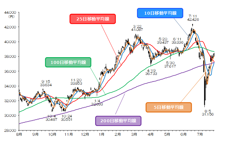 日経平均株価(図表1)は8月上旬に生じた急落後の安値から反発基調が続く。8/23は弱含む場面もあったが、5日移動平均線(37,995円 8/23)上でしっかりの展開となった。