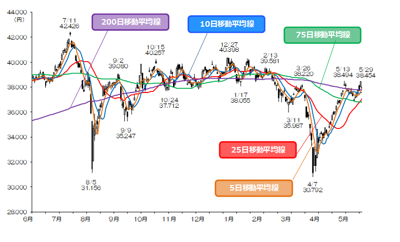 5/30は200日移動平均線(37,794円 5/30)を下値で意識し、終値では5日移動平均線(37,875円 同)上を保つ陽線を形成した。4/7安値(30792円)を起点とした短期波動は上昇継続の判断となる。