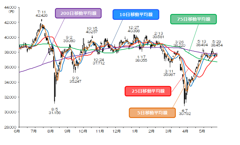 上値メドは、5/29高値(38,454円)、心理的節目の39,000円、心理的節目の39,500円、2/13高値(39,581円)、心理的節目の4万円などがある。下値メドは、心理的節目の37,000円、75日移動平均線、心理的節目の36,500円や36,000円などがある。