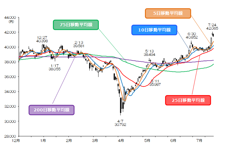 日経平均株価(図表1)は上値を伸ばす展開となっている。7/23は5日移動平均線(40,809円 7/25)上で長い陽線を形成し、6/30につけた年初来高値を大幅に更新。7/24は前日の大幅高からのモメンタムが減速する格好となり、42,000円の目標達成感なども意識された。