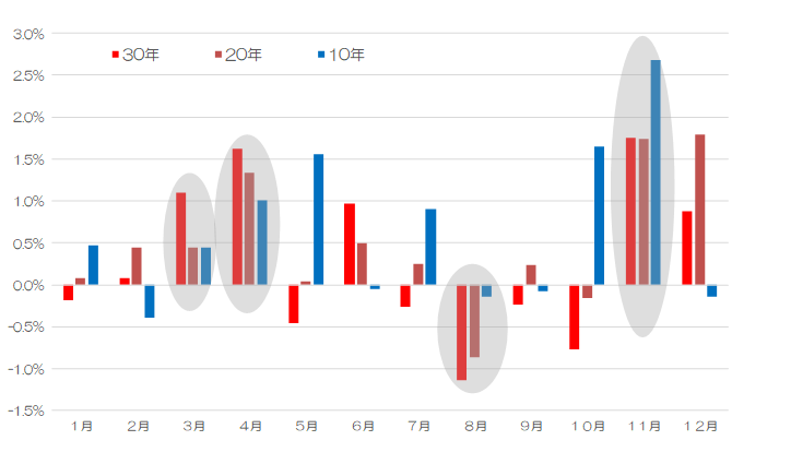 一方、今週の値動きにもよるが、SQ通過後となる来週あたりからは留意が必要だろう。図表1のように、過去のアノマリーでいくと、8月相場は軟調である。計測期間によって騰落の方向は変化するが、直近10年、20年、30年の騰落が同じ方向に一致するということもあり、8月は昨年の急落があったように、軟調というイメージを持つ必要はある。ただ一方で、11月は上昇する傾向が強いことも確認できる。そういった観点では8月は短期的には調整局面を迎える可能性は高いが、それが一巡すると年末に向けては水準を切り上げていく想定はできそうだ。
