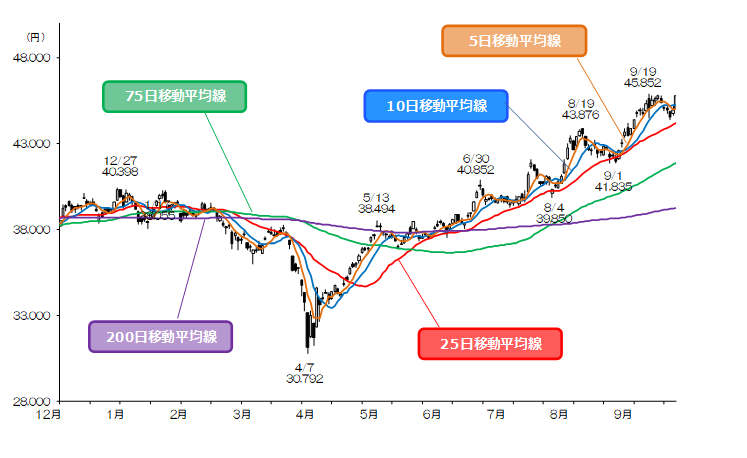 5日移動平均線(45,046円 10/3)や10日移動平均線(45,251円 同)などの短期線上へ一気に回復する強い陽線を形成した。目先は高値更新後の揺り戻し(微調整)も想定されるが、5日移動平均線の上昇を背景に大幅高が続くかが週前半の焦点となる。