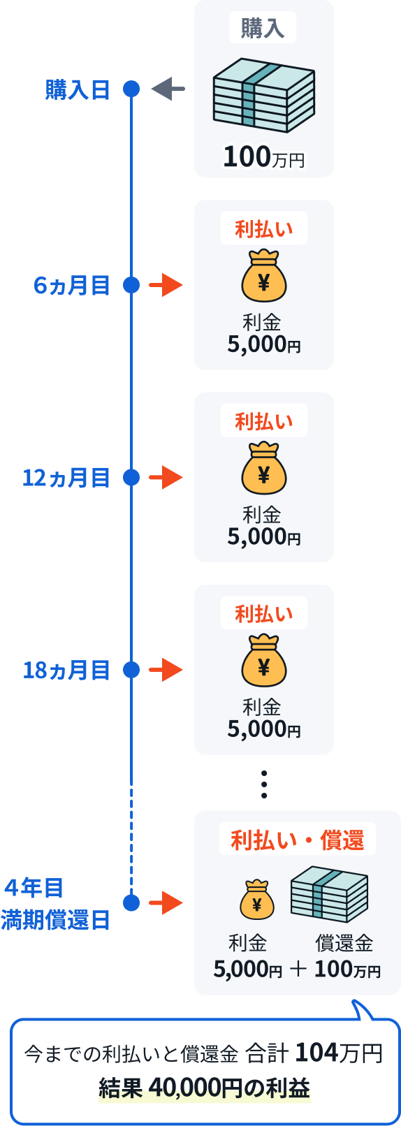 円貨建債券 期間4年(年2回利払い)、年利率1%(仮定)を100万円購入した場合
