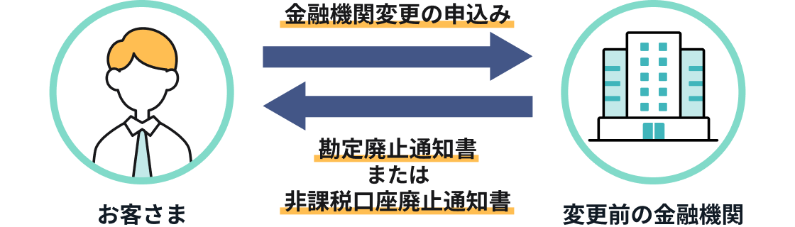 現在NISA口座を開設している金融機関にNISA口座の金融機関変更手続きを行っていただき、「勘定廃止通知書」または「非課税口座廃止通知書」をお受け取りください。