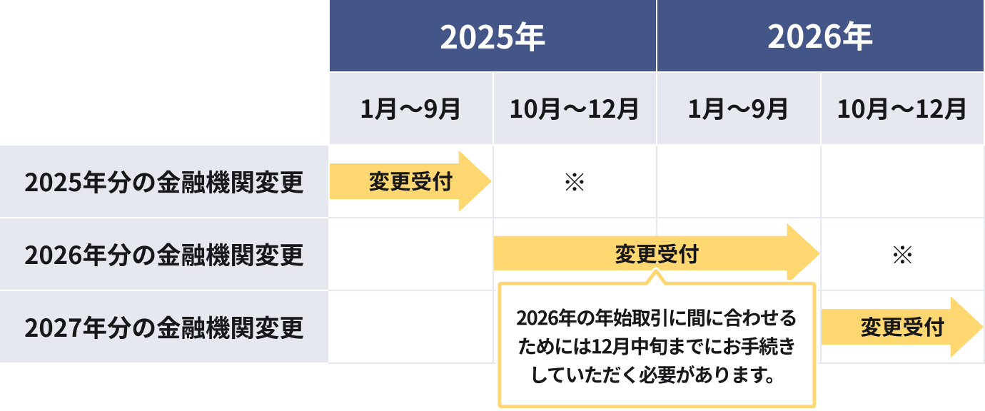 金融機関を変更するには、変更したい年の前年10月1日から当年9月末までに「廃止通知書」を提出し、手続きを完了していただく必要があります。